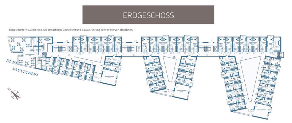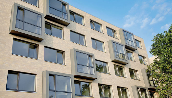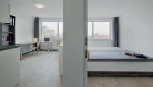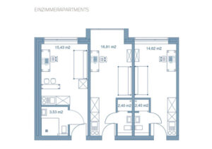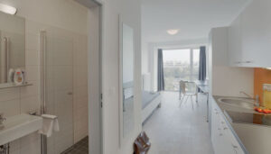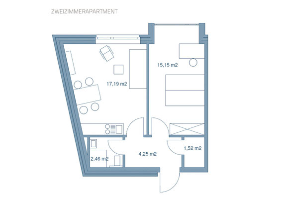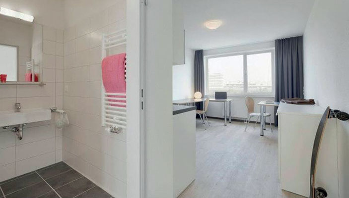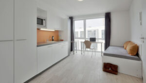 Jede Wohneinheit verfügt über eine eigene Pantry Küche und ein eigenes Badezimmer, viele Zimmer sind zusätzlich mit einem Erker ausgestattet. Die Apartments sind zeitgemäß und modern möbliert. Ergänzend zum privaten Wohnraum bieten drei lichtdurchflutete Innenhöfe und verschiedene Gemeinschaftsräume zusätzliche Aufenthaltsqualität.
