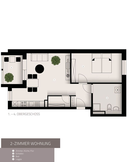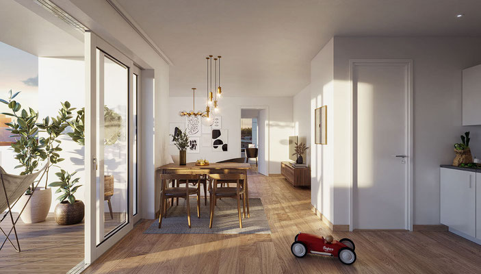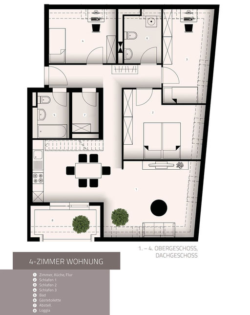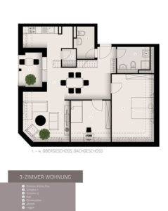 Im Sockelbereich sind gewerbliche Nutzungen vorgesehen, um dem Anspruch eines urbanen und durchmischten Quartiers gerecht zu werden. In den Obergeschossen entsteht ein Wohnungsmix von rund 28 unterschiedlichen Wohnunggrössen, der breite Bevölkerungsschichten anspricht und eine soziale und demografische Durchmischung fördert. Der dritte Baukörper wird als dreigeschossiges Hofgebäude ausgeführt und einer reinen Wohnnutzung zugeführt. Hier entstehen etwa 20 Mikroapartments.