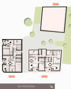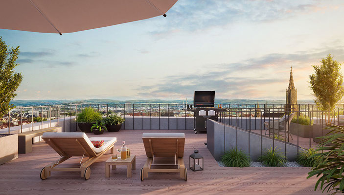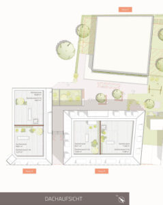 Ein besonderes Augenmerk liegt auf der Gestaltung des Hinterhofs. Durch eine attraktive Aussenraumgestaltung wird dieser zu einer „Grünen Oase“ mit Aufenthaltsqualität, die beispielgebend für die Entwicklung und Aufwertung der Ulmer Hinterhöfe werden kann. Das Hinterhaus trägt mit Elementen der Fassadenbegrünung zur grünen Innenhofgestaltung bei.