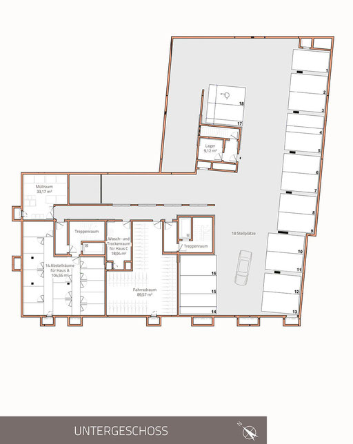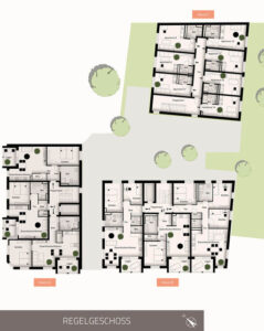 Über eine Passage im Erdgeschoss der Gebäudefuge erfolgt der Zugang zum Hof, von dem die Wohngebäude erschlossen werden. Der begrünte Freiraum wird so zur Begegnungsfläche, die als Plattform für Kommunikation und nachbarschaftliche Interaktion dient. Die notwendigen Stellplätze werden in einer Tiefgarage angeboten, Nebenräume und ein Teil der Fahrradstellplätze sind ebenfalls unterirdisch untergebracht.