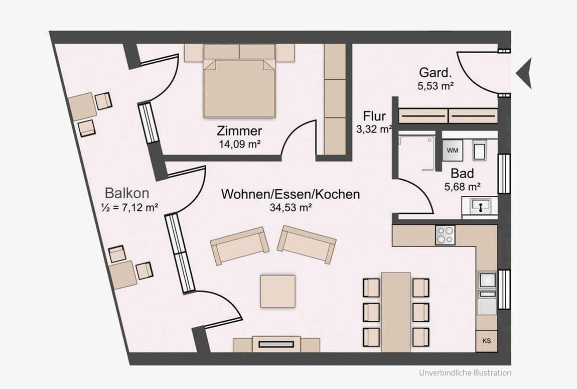 Der Wohnungstyp 2 ist ebenfalls sowohl im Erdgeschoss als auch im ersten Obergeschoss vertreten. Die Wohnungen bieten je zwei Zimmer mit einer Wohnfläche von rund 70,1 Quadratmetern. Der Kochen-Essen-Wohnen-Bereich misst 33,46 Quadratmeter, das Schlafzimmer 14,45 Quadratmeter. Hinzu kommen ein Bad mit knapp fünfeinhalb Quadratmetern, Flur und Garderobe sowie ein Balkon mit 8,03 Quadratmetern, der hälftig in die Wohnfläche einfließt.