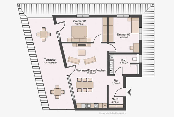 Der Wohnungstyp 3 wird im Erdgeschoss und ersten Obergeschoss als größere Drei-Zimmer-Variante realisiert. Die Wohnungen verfügen über zwei Schlafzimmer mit jeweils etwa 14,7 und 14,3 Quadratmetern und eine gesamte Wohnfläche von 103,49 Quadratmetern. Der Kochen-Essen-Wohnen-Bereich umfasst 36,69 Quadratmeter. Ergänzt wird der Grundriss durch ein Bad mit 8,68 Quadratmetern, Flur und Garderobe, einen Abstellraum mit 5,65 Quadratmetern sowie einen Balkon mit 8,00 Quadratmetern, der wiederum zur Hälfte angesetzt wird.