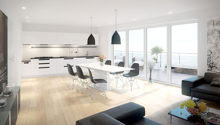 Im Haus An der Kastanie werden im Erdgeschoss und im ersten Obergeschoss sechs Zwei und Drei Zimmer Wohnungen realisiert. Die Grundrisse sind offen gestaltet, mit großzügigen Wohn Ess Kochbereichen und klar geschnittenen Zimmern. Jede dieser Wohnungen verfügt über einen Balkon, der den Wohnraum nach außen erweitert. Im Staffelgeschoss entstehen zwei Penthouse Wohnungen mit großen Terrassen und weiten Ausblicken.