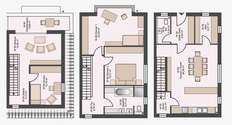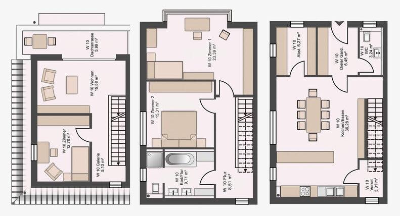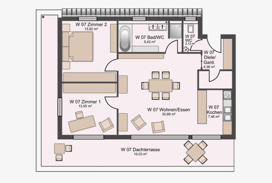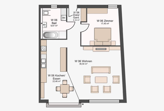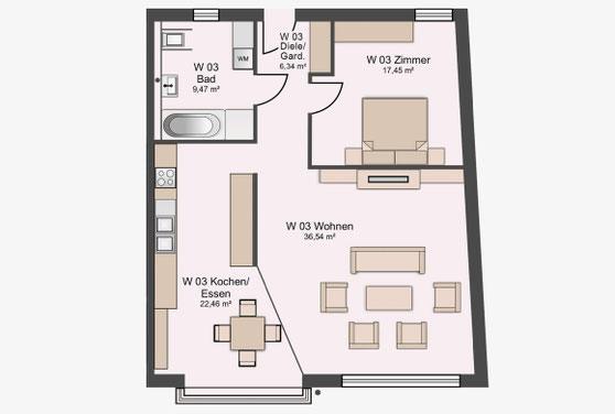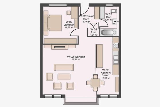 Große Fensterflächen, Dachterrassen in den oberen Geschossen und funktional geschnittene Grundrisse sorgen für zeitgemäßen Wohnkomfort. Die Nutzungsmischung aus Wohnen und Gewerbe stärkt die Frequenz im Umfeld und nutzt das innerstädtische Grundstück effizient. Insgesamt stehen 17 Pkw Stellplätze und Abstellräume im Untergeschoss zur Verfügung. Die Planung erfolgte nach EnEV 2014.