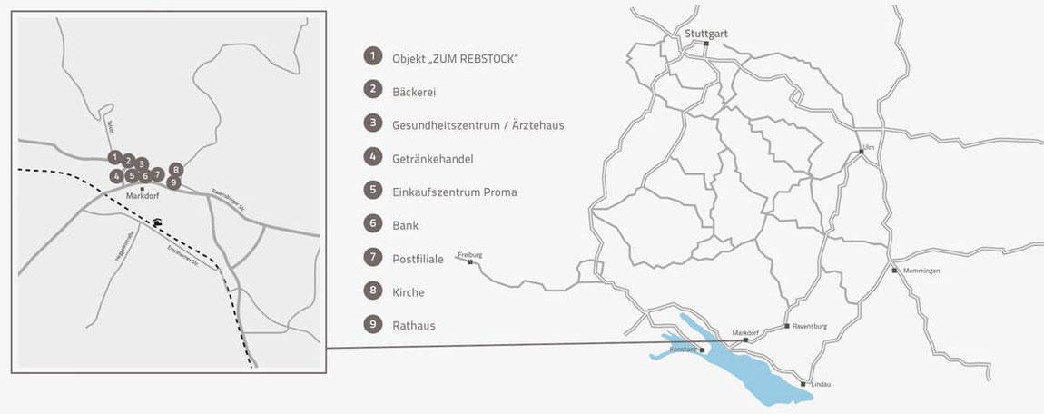 Das Wohn- und Gewerbehaus Zum Rebstock liegt in zentraler Lage an der Hauptstraße in Markdorf. Markdorfs Zentrum mit Geschäften, Ärzten, Gastronomie und Dienstleistungen befindet sich in unmittelbarer Nähe und ist bequem zu Fuß erreichbar. Die Stadt hat sich in den vergangenen Jahren zu einem gefragten Wohn- und Wirtschaftsstandort im Bodenseekreis entwickelt.